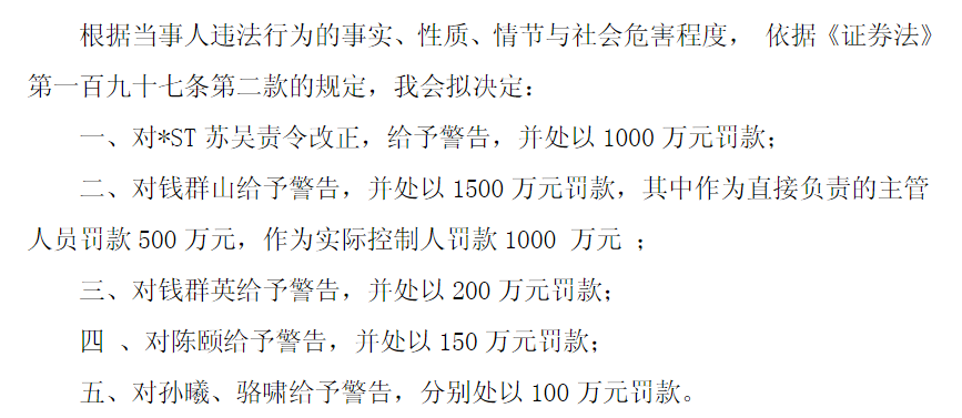 针对前述违法行为,证监会拟决定对*st苏吴责令改正,给予警告,并处以1000万元罚款。并对*st苏吴实际控制人、董事长钱群山给予警告,并处以1500万元罚款。对其余4位责任人给予警告,并分别处以100万元至200万元罚款。